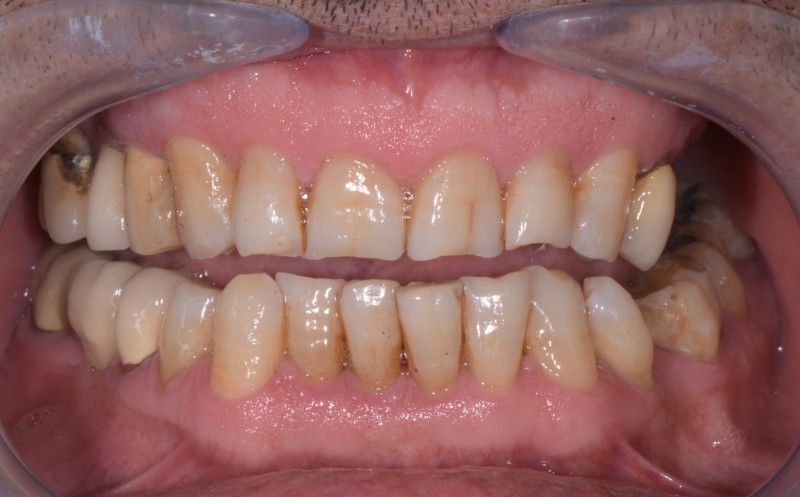 A causa della mancanza di alcuni elementi dentari posteriori e la presenza di vecchi restauri protesici rendeva necessaria una riabilitazione implanto-protesica. Oltretutto, la mancanza dei denti posteriori aveva creato un sovraccarico dei denti anteriori che presentavano diversi segni di usura e perdita di smalto, con conseguente perdita di dimensione verticale (DVO) e prggioramento dell'estetica del sorriso.