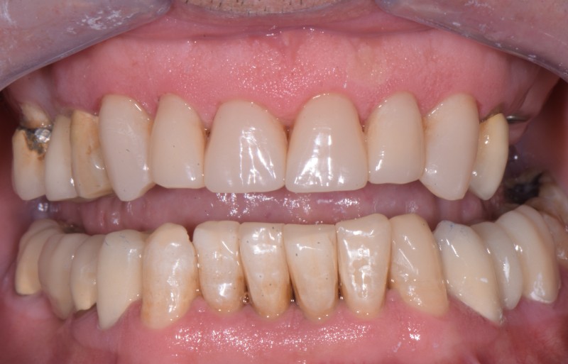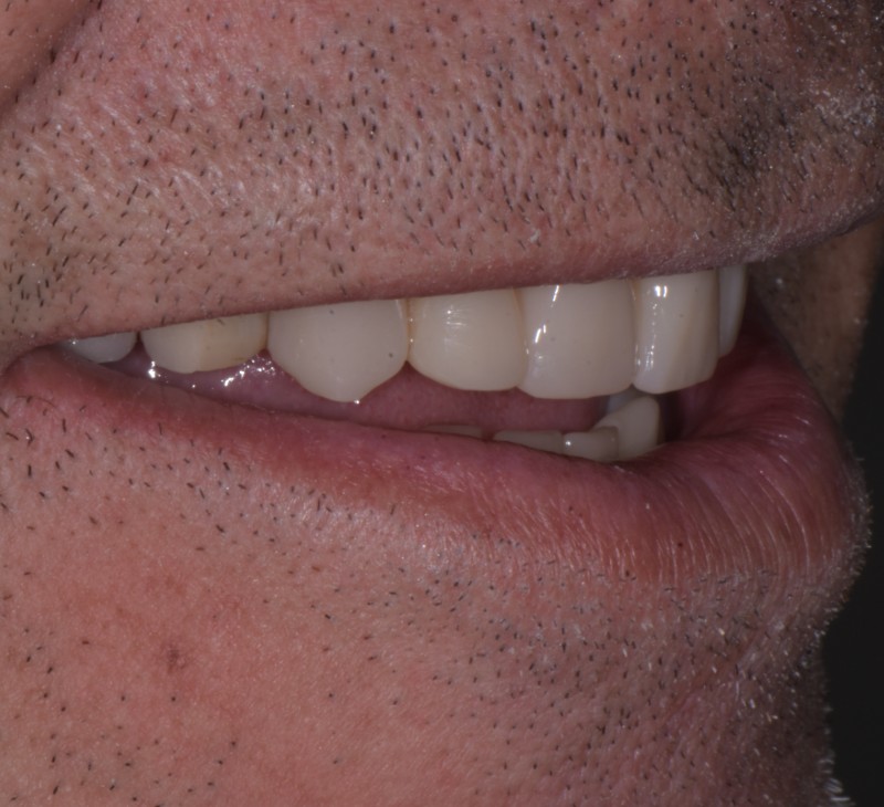A seguito dell'inserimento di impianti e provvisori nei settori posteriori, in attesa della perfetta osteo integrazione, si è proceduto con una seduta totalmente indolore che ha permesso di ripristinare morfologicamente i denti frontali: il paziente dopo 2 ore è uscito totalmente soddisfatto del nuovo sorriso ottenuto.